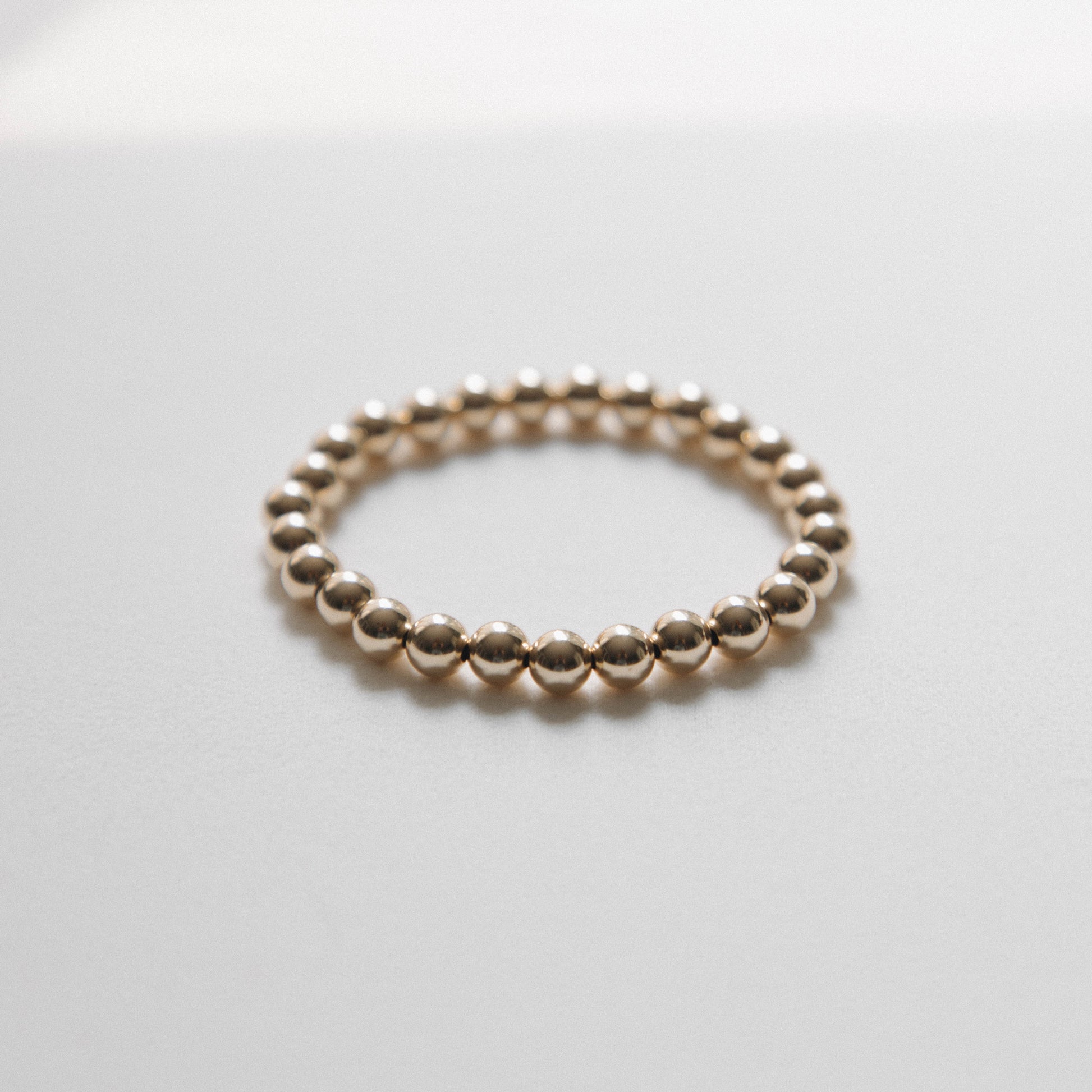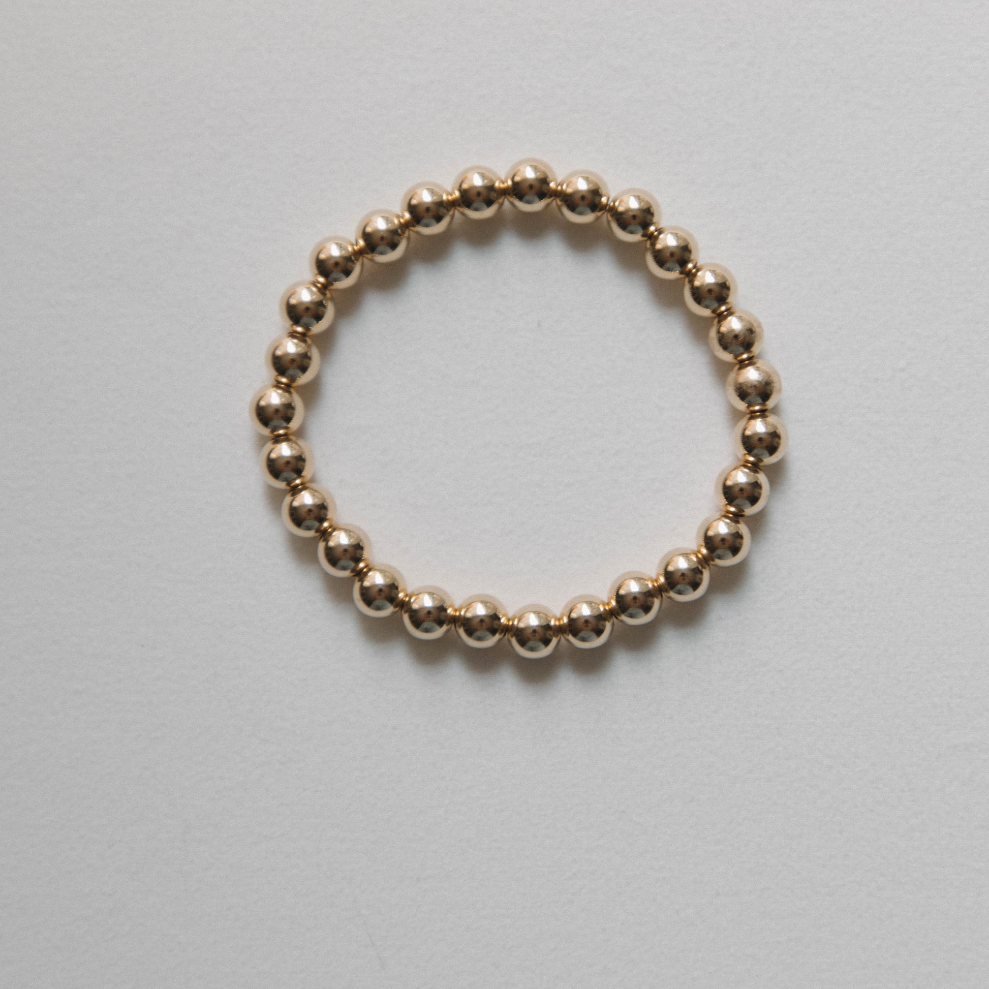 Our signature 14k Gold Filled beads, in size 7mm, shining bright all on their own. Hand strung on elastic jewelers string, this piece should be rolled on and off instead of stretched. This piece is an essential to any stack. Gold Beads are 14k Gold Filled & will not tarnish. Gold Filled is a hypoallergenic, waterproof material made for daily wear. Despite these qualities, it's still important to handle with care. It is recommended that you remove any type of gold or gemstone jewelry in salt and chlorine water due to their corrosive properties. Available in 5 sizes.