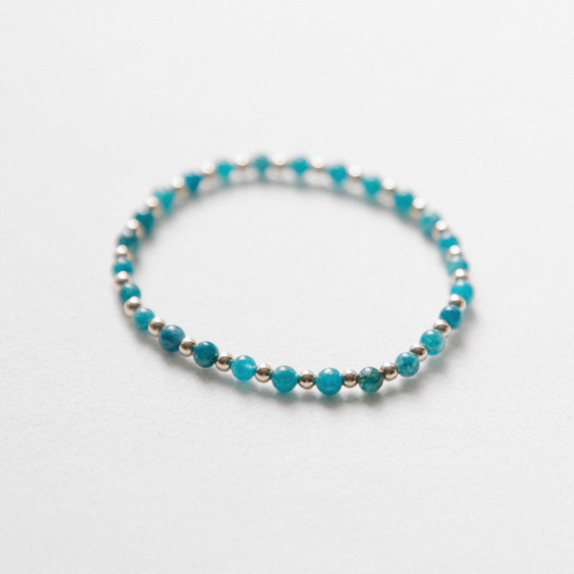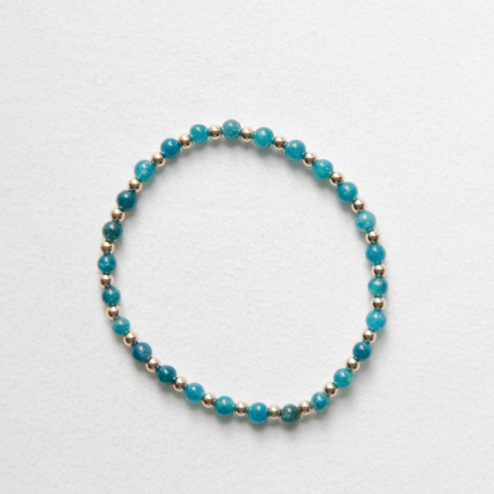 Apatite is said to help with communication. Also said to help with productivity & quick thinking. Hand-strung on elastic jeweler's string, this piece should be rolled on and off instead of stretched. Gold Beads are 14k Gold Filled & will not tarnish. Gold Filled is a hypoallergenic, waterproof material made for daily wear. Despite these qualities, it's still important to handle with care. It is recommended that you remove any type of gold or gemstone jewelry in salt and chlorine water due to their corrosive properties.