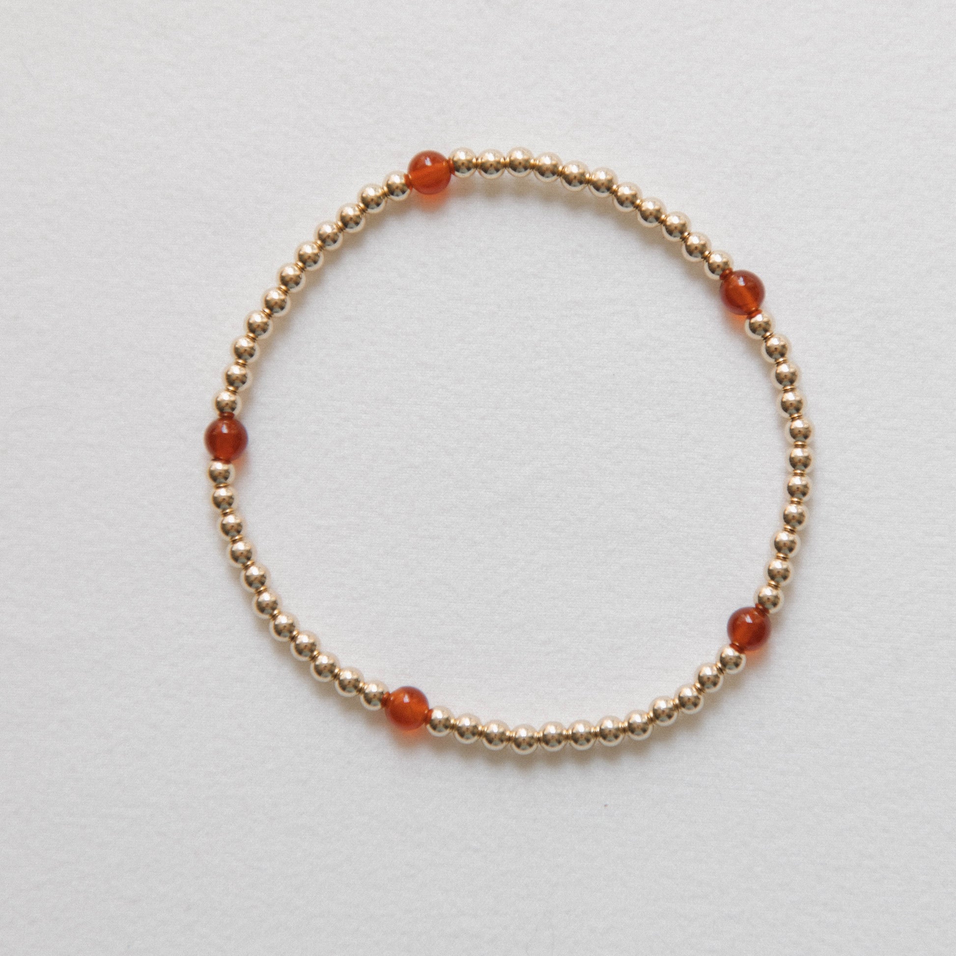 Carnelian is a fire stone, connected to the lower 3 chakras. Brings bold energy, warmth, endurance, and prosperity. Hand strung on elastic jewelers string, this piece should be rolled on and off instead of stretched. Gold Beads are 14k Gold Filled & will not tarnish.