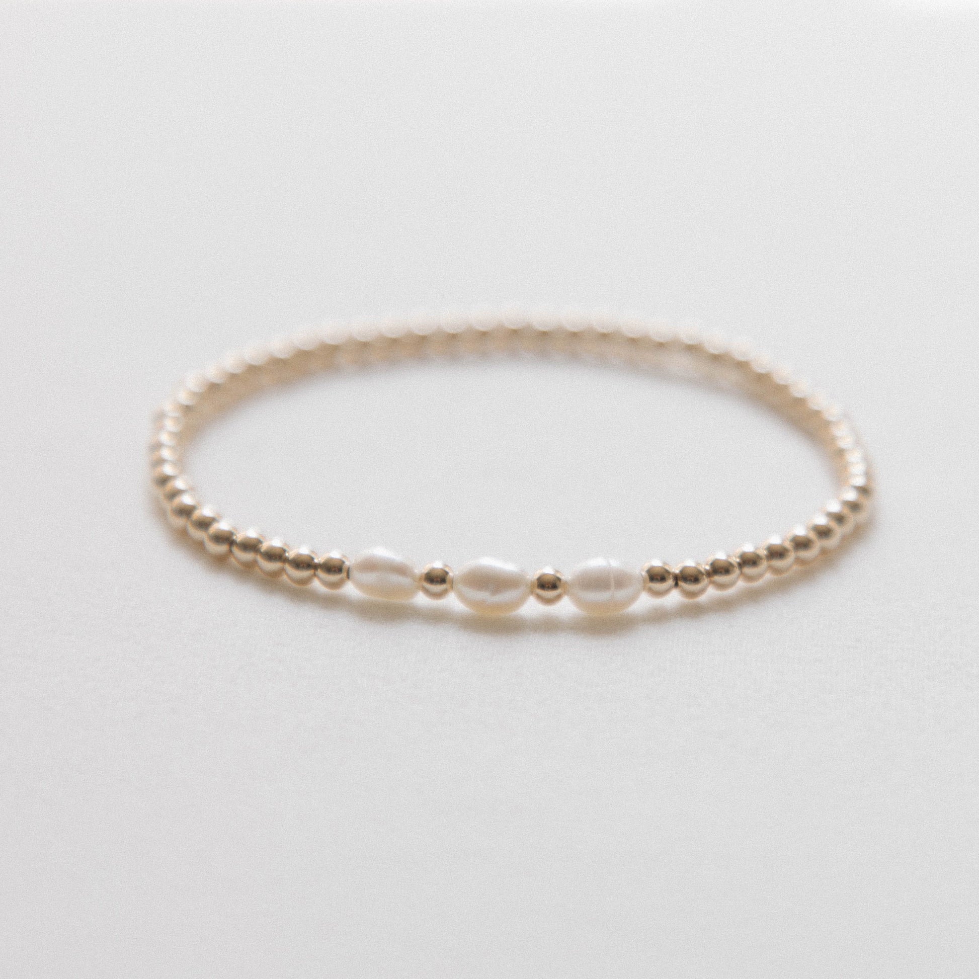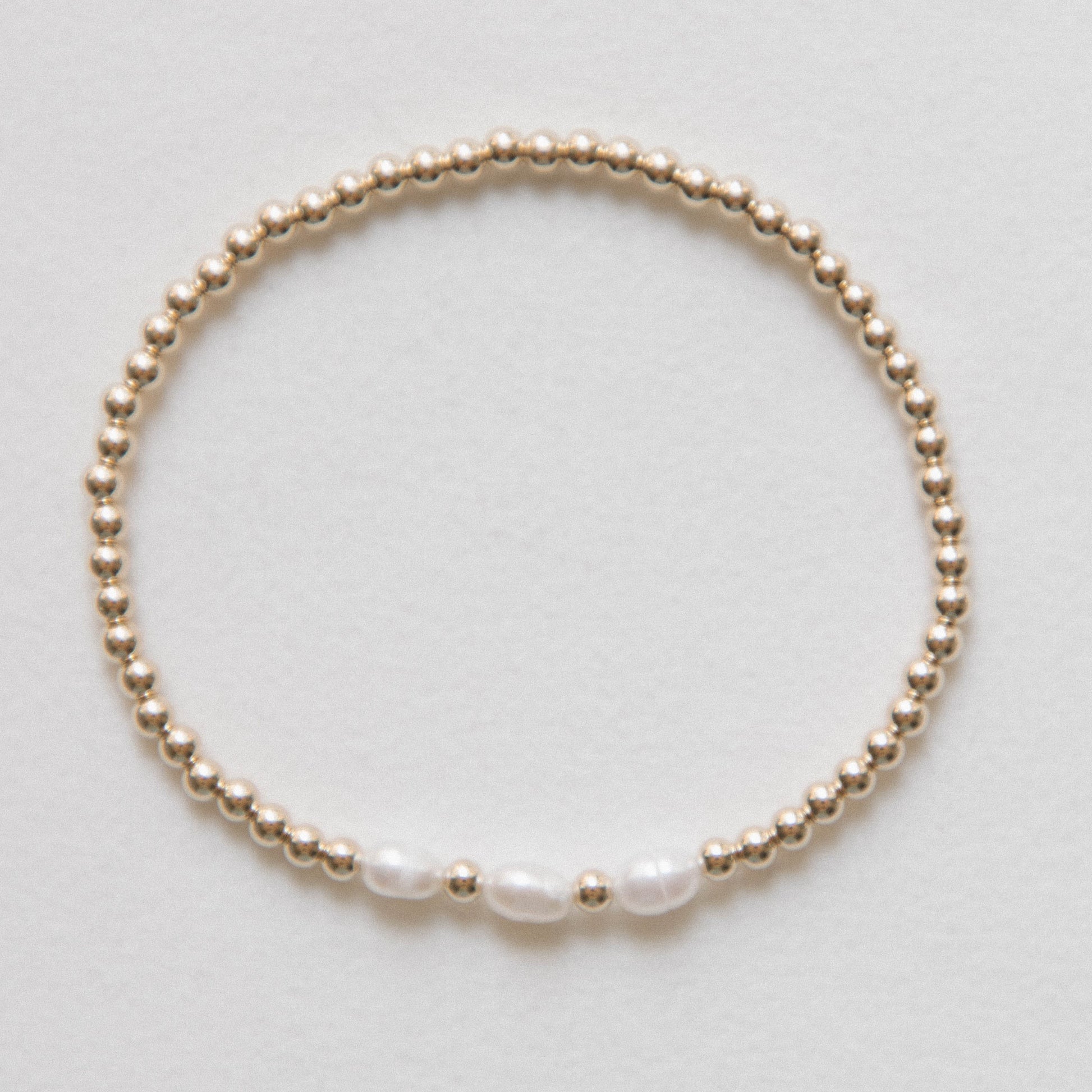 Pearls are one of the few organic gemstones. Fresh Water Pearls are said to bring personal integrity, bring truth forward, and grow sincerity. Hand-strung on elastic jeweler's string, this piece should be rolled on and off instead of stretched. Gold Beads are 14k Gold Filled & will not tarnish. Gold Filled is a hypoallergenic, waterproof material made for daily wear. Despite these qualities, it's still important to handle with care. It is recommended that you remove any type of gold or gemstone jewelry in salt and chlorine water due to their corrosive properties. Available in 5 sizes.