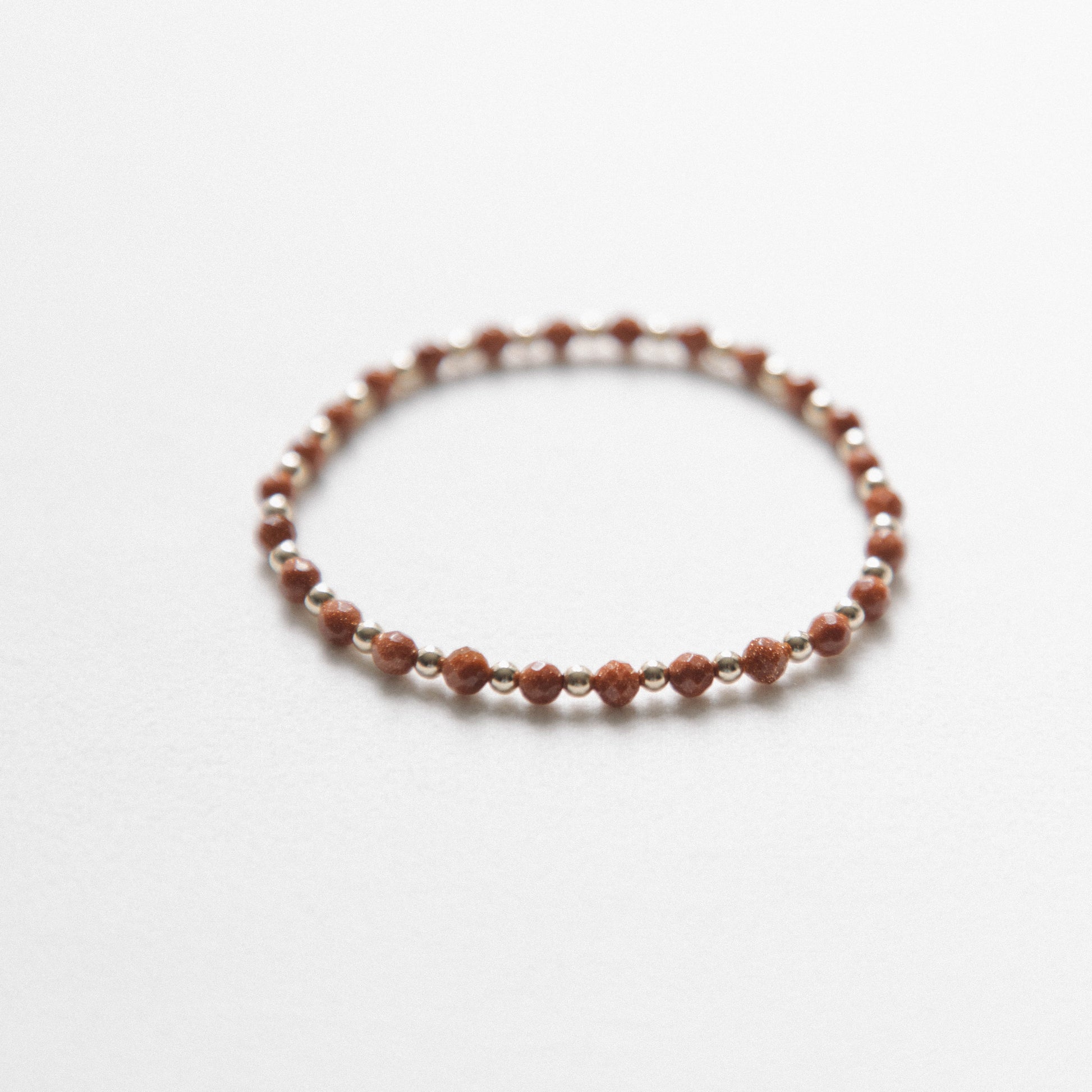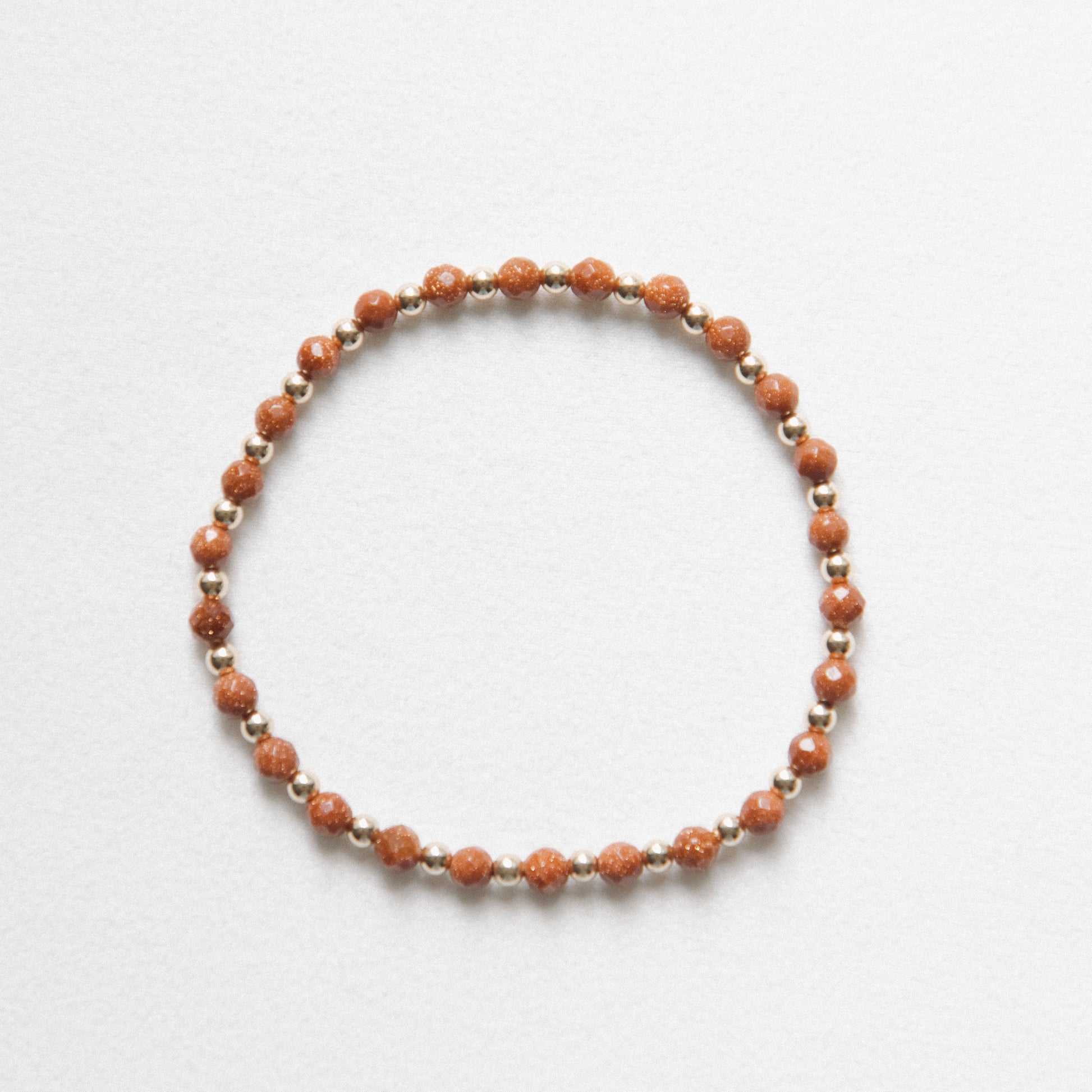 Technically not gold , or a stone, goldstone is still sought after due to its sparkly flakes. It is said to help with confidence and ambition. Hand strung on elastic jewelers string, this piece should be rolled on and off instead of stretched. Gold Beads are 14k Gold Filled & will not tarnish. Gold Filled is a hypoallergenic, waterproof material made for daily wear. Despite these qualities, its still important to handle with care. It is recommended that you remove any type of gold or gemstone jewelry in salt and chorine water due to their corrosive properties. Available in 5 sizes.