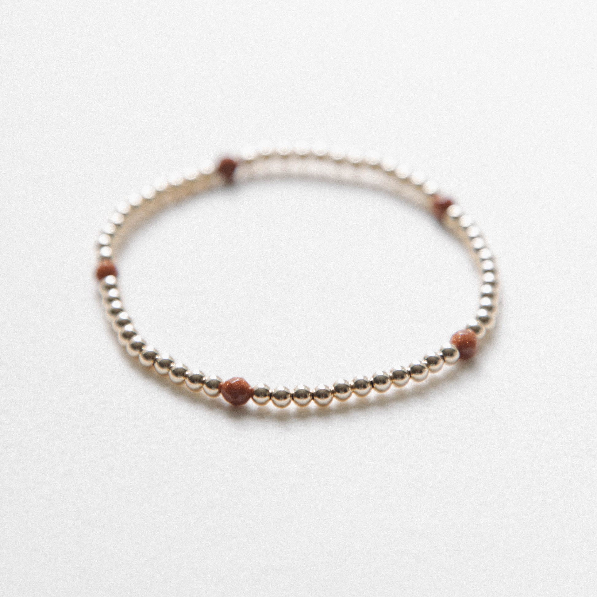Technically not gold, or a stone, goldstone is still sought after due to its sparkly flakes. It is said to help with confidence and ambition. Hand-strung on elastic jeweler's string, this piece should be rolled on and off instead of stretched. Gold Beads are 14k Gold Filled & will not tarnish.
