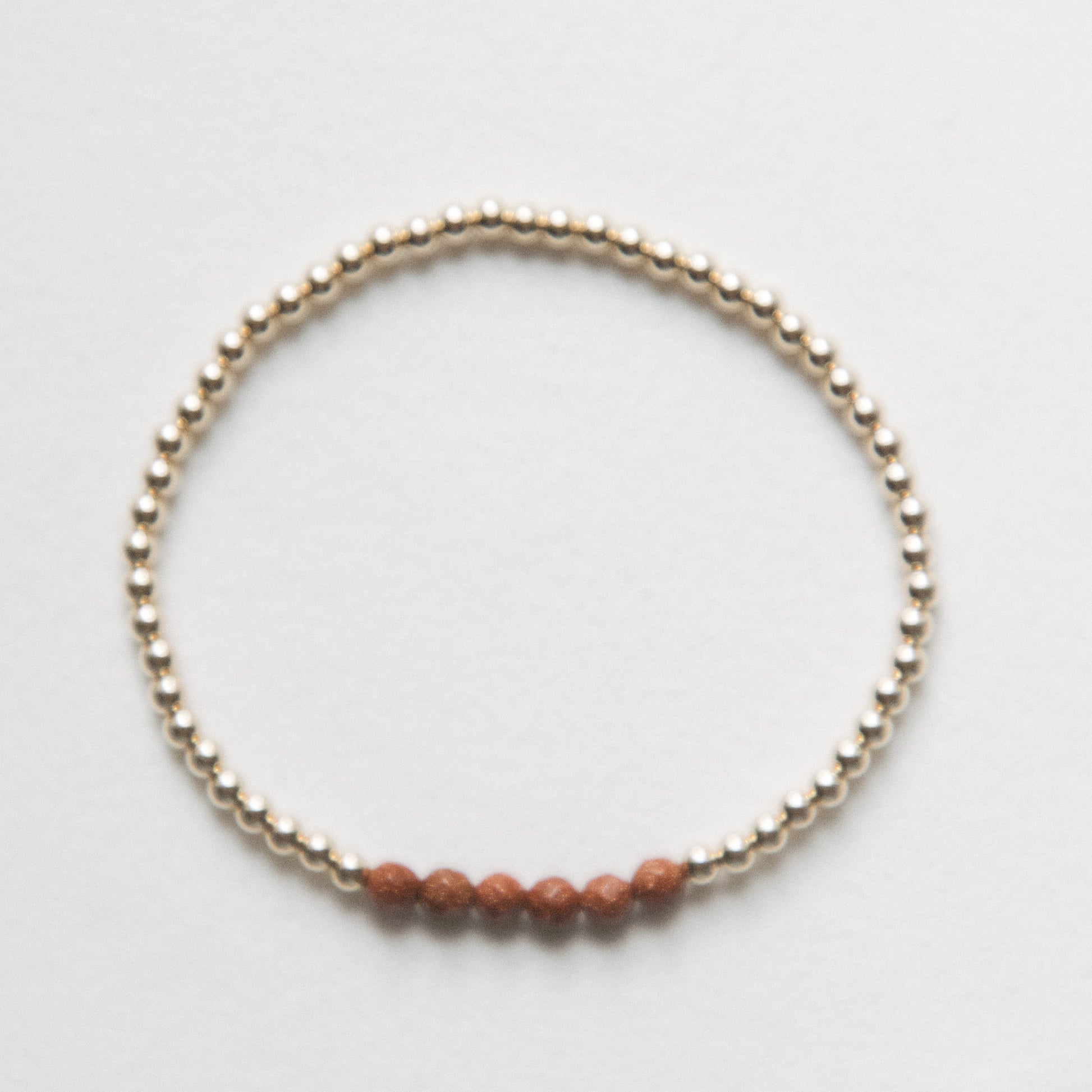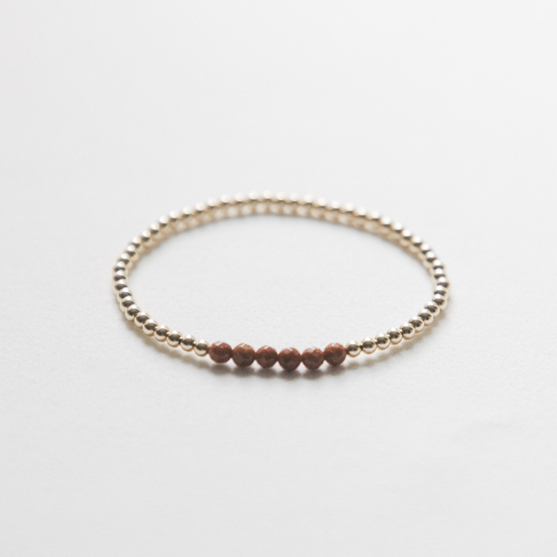 Technically not gold , or a stone, goldstone is still sought after due to its sparkly flakes. It is said to help with confidence and ambition. Hand strung on elastic jewelers string, this piece should be rolled on and off instead of stretched. Gold Beads are 14k Gold Filled & will not tarnish. Gold Filled is a hypoallergenic, waterproof material made for daily wear. Despite these qualities, its still important to handle with care. It is recommended that you remove any type of gold or gemstone jewelry in salt and chorine water due to their corrosive properties. Available in 5 sizes.