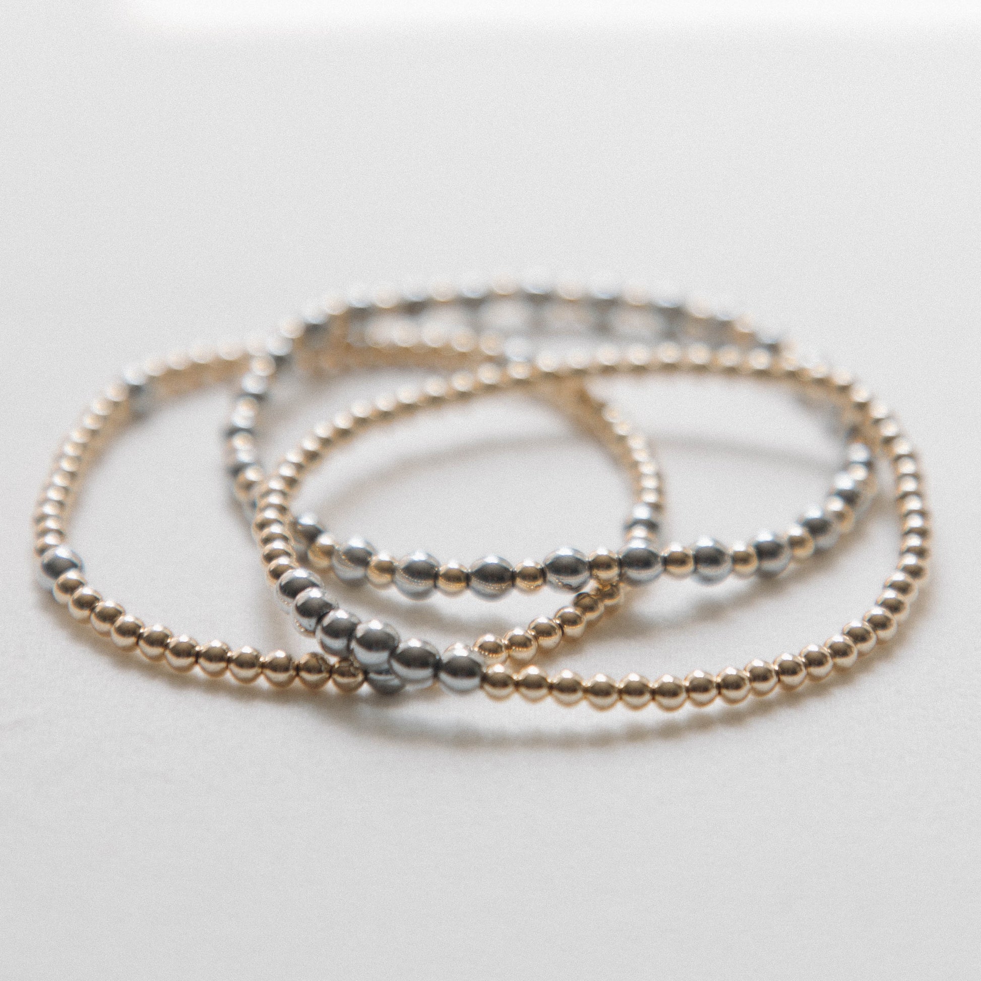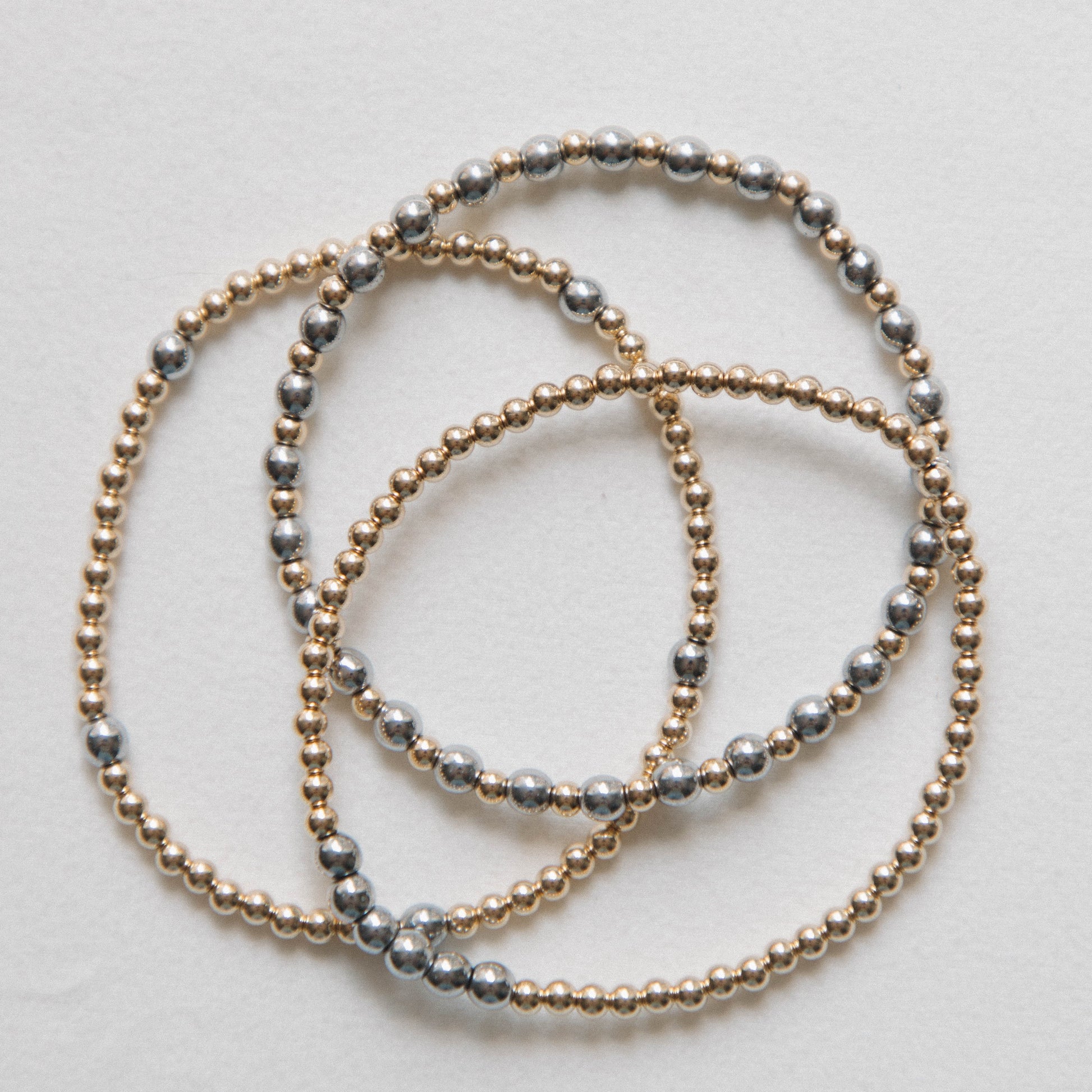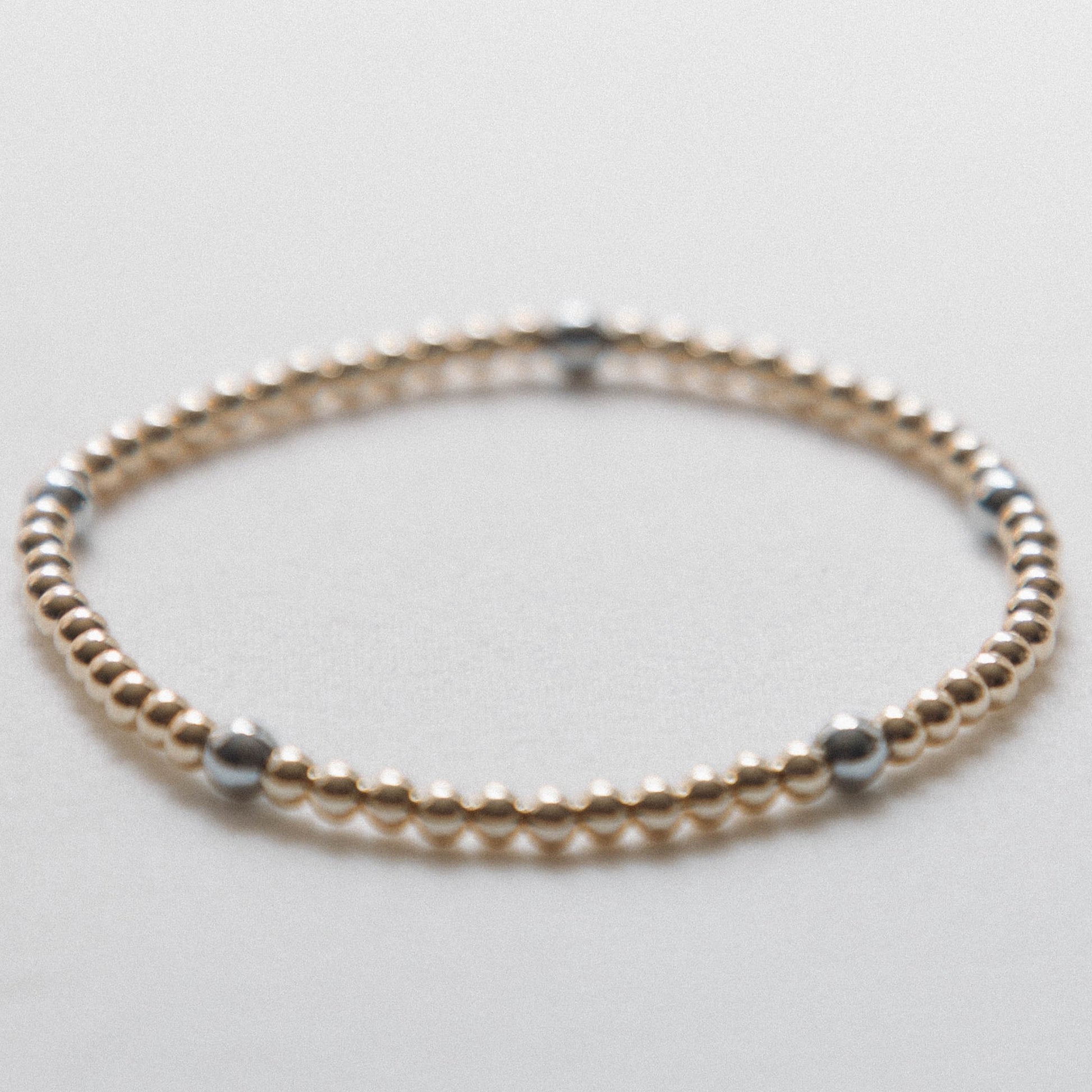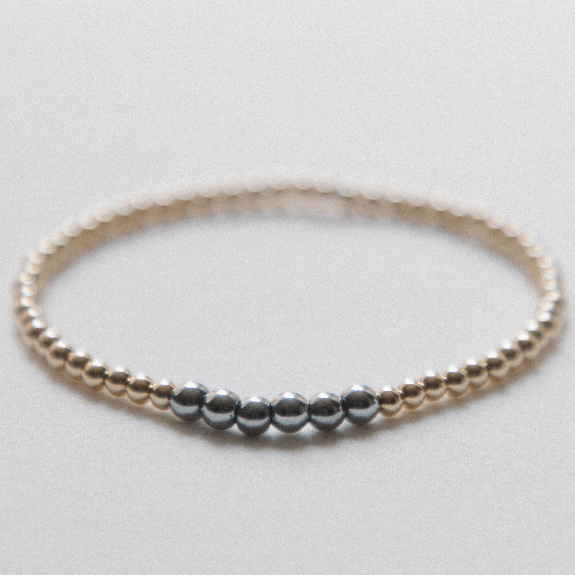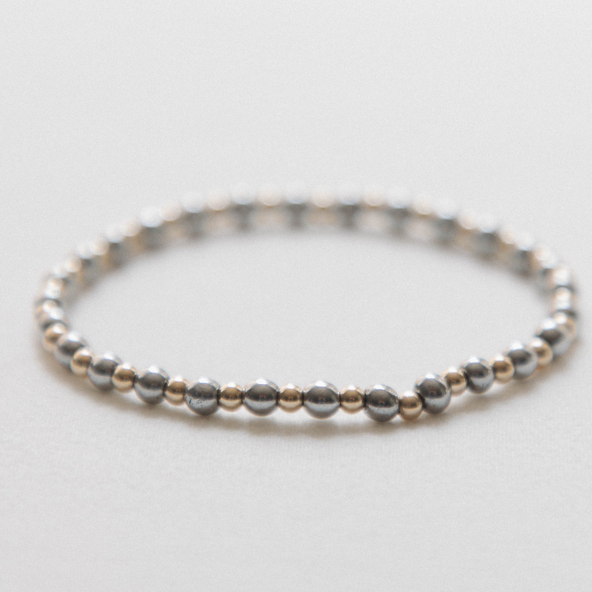 Hematite is a grounding stone bringing us back to Earth when we need it most. It will also help with acceptance. Hematite has a cooling calming effect. Hand-strung on elastic jeweler's string, this piece should be rolled on and off instead of stretched. Gold Beads are 14k Gold Filled & will not tarnish.