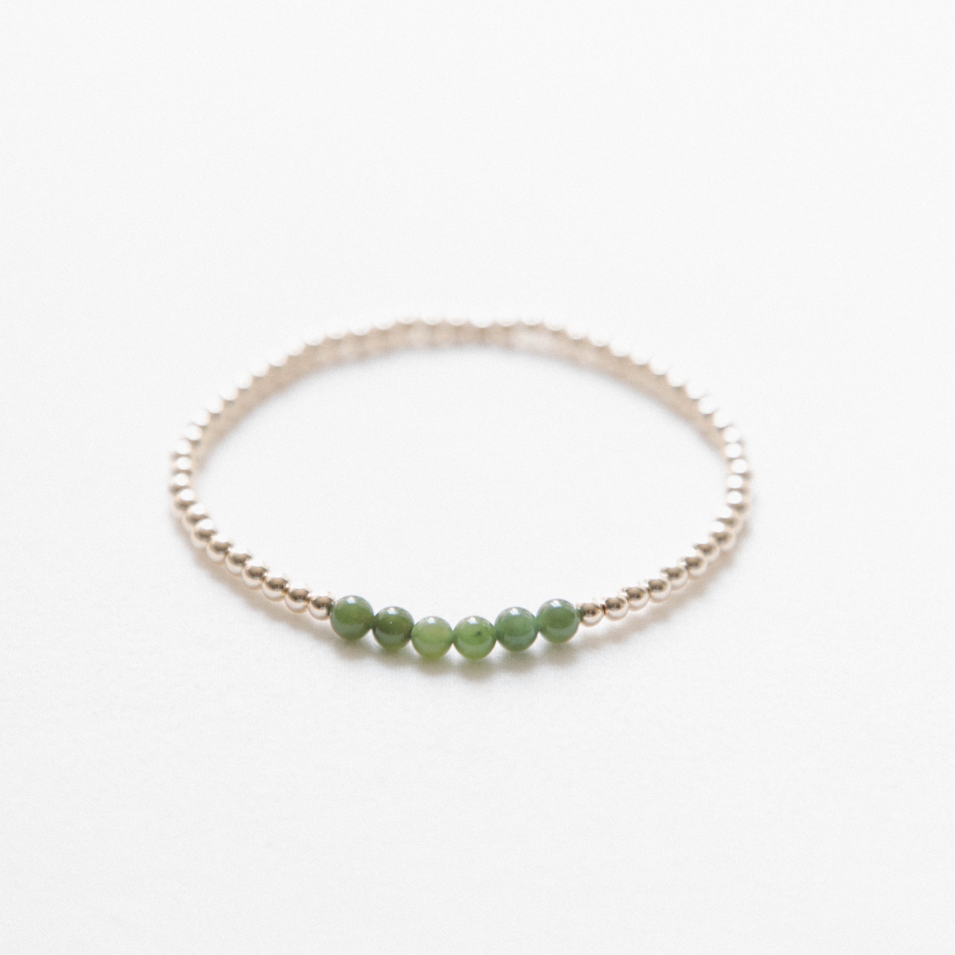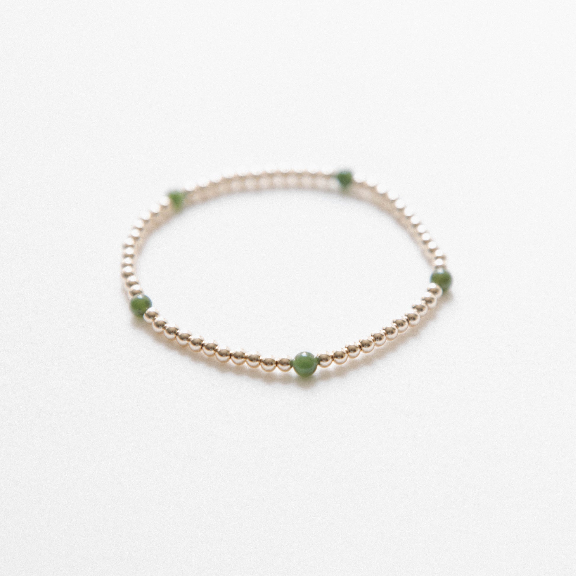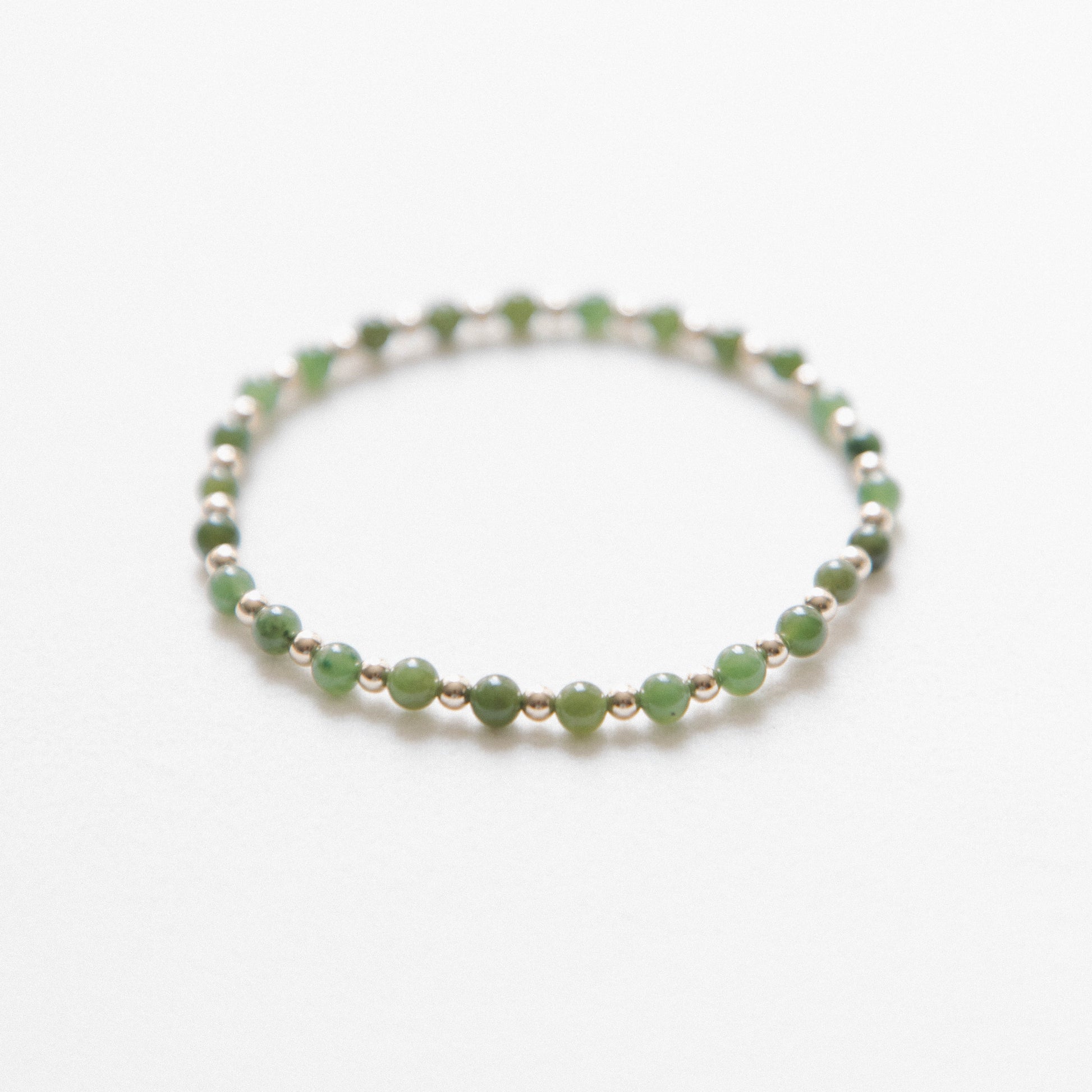 Wearing Jade will guide you to a richer life, not necessarily meaning money. Jade represents both longevity and wealth. Hand-strung on elastic jeweler's string, this piece should be rolled on and off instead of stretched. Gold Beads are 14k Gold Filled & will not tarnish.