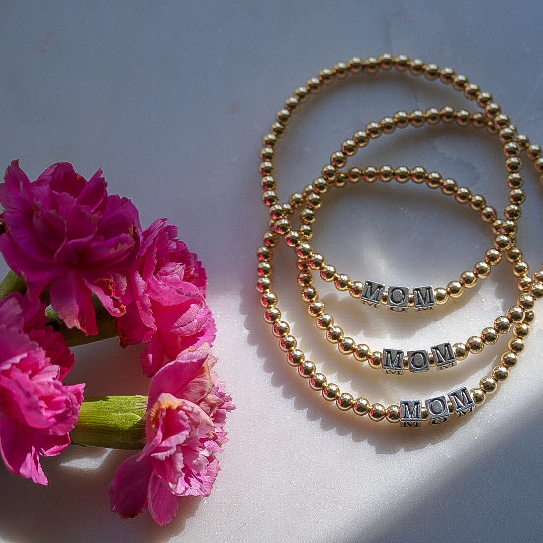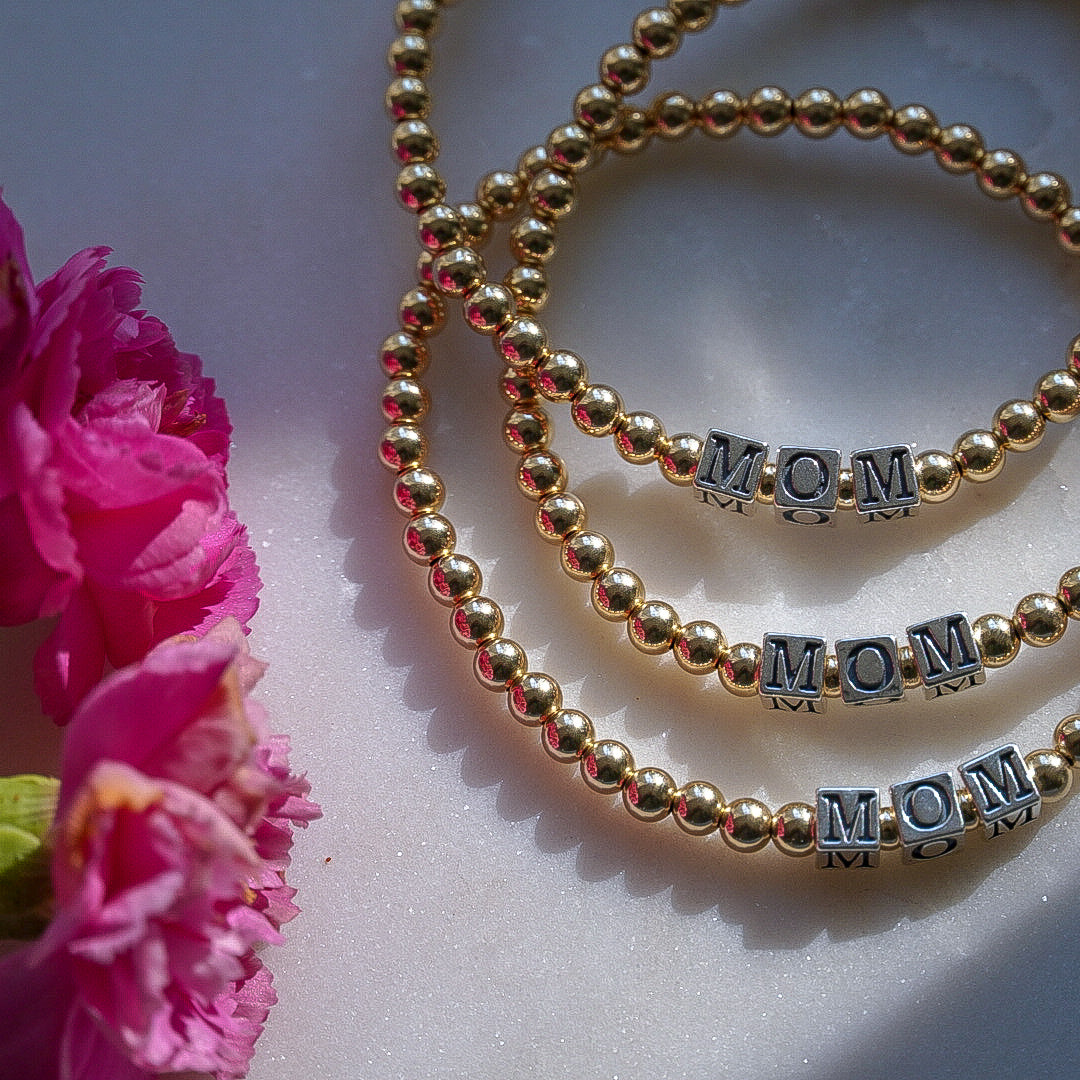 Celebrate Mom all year round with this stacking word bracelet made with 4mm gold filled beads and .925 sterling silver block letters. Hand strung on elastic jewelers string, this piece should be rolled on and off instead of stretched. Gold Filled is a hypoallergenic, waterproof material made for daily wear. Despite these qualities, it's still important to handle with care. It is recommended that you remove any type of gold or gemstone jewelry in salt and chorine water due to their corrosive properties. Available in 5 sizes. Custom words are not accepted at this time.