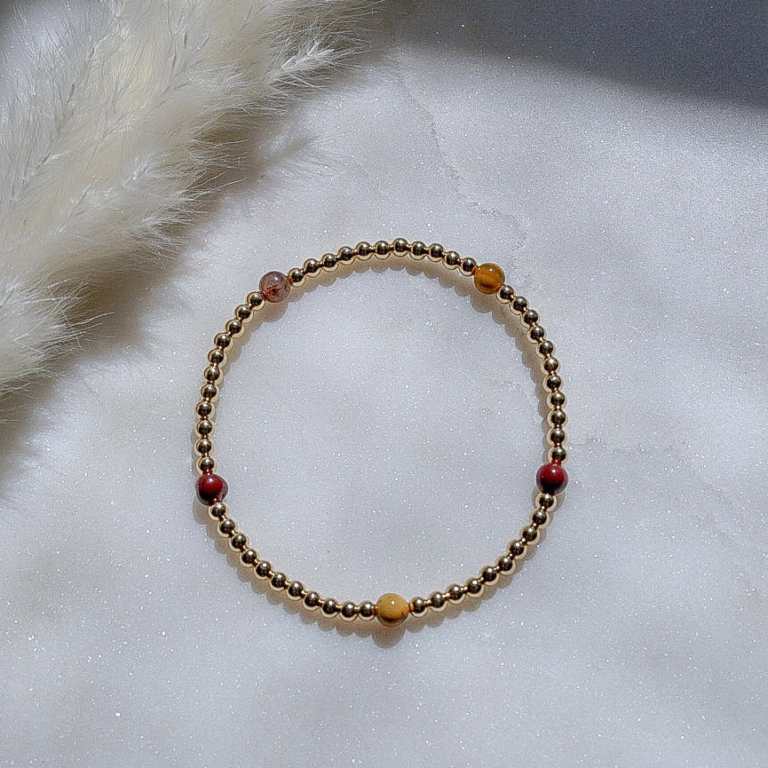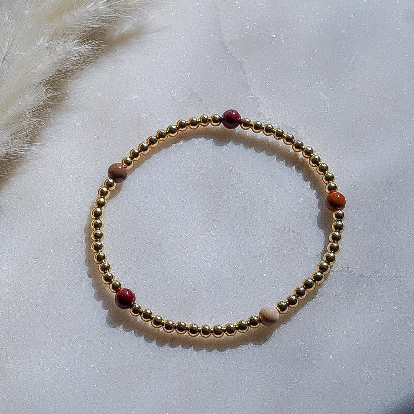 A great stone for stress. Mookaite can also help with decision making. Mookaite is also a grounding stone. Hand strung on elastic jewelers string, this piece should be rolled on and off instead of stretched. Gold Beads are 14k Gold Filled & will not tarnish. Gold Filled is a hypoallergenic, waterproof material made for daily wear. Despite these qualities, its still important to handle with care. It is recommended that you remove any type of gold or gemstone jewelry in salt and chorine water due to their corrosive properties. Available in 5 sizes.