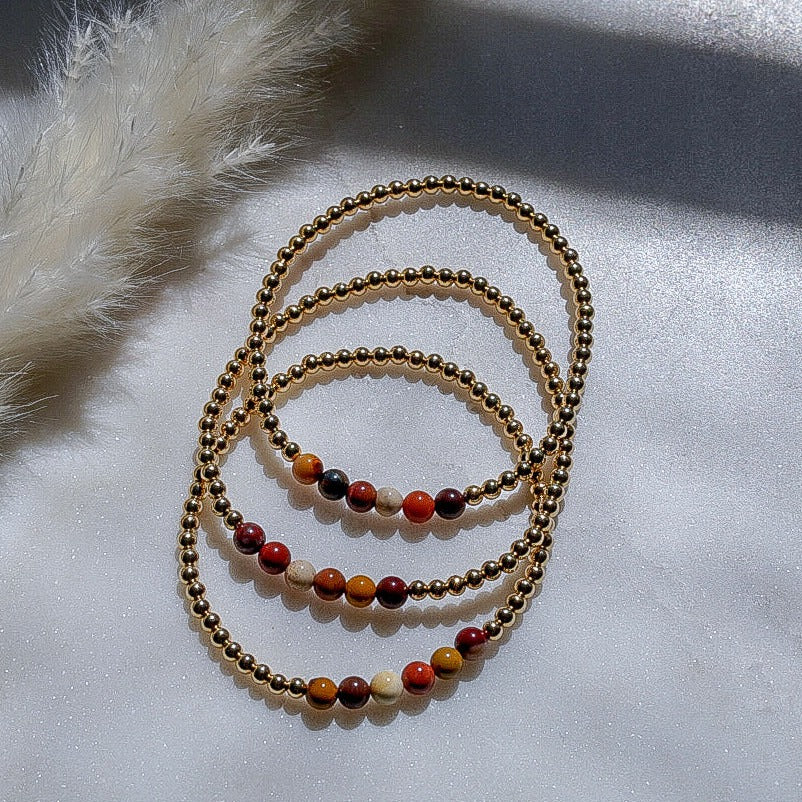 A great stone for stress. Mookaite can also help with decision making. Mookaite is also a grounding stone. Hand strung on elastic jewelers string, this piece should be rolled on and off instead of stretched. Gold Beads are 14k Gold Filled & will not tarnish. Gold Filled is a hypoallergenic, waterproof material made for daily wear. Despite these qualities, its still important to handle with care. It is recommended that you remove any type of gold or gemstone jewelry in salt and chorine water due to their corrosive properties. Available in 5 sizes.