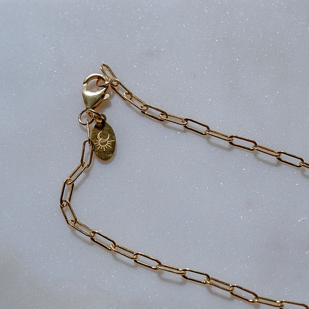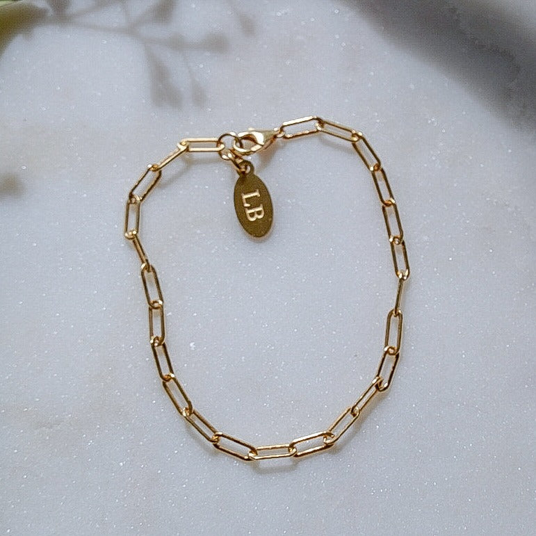 A 14k Gold Filled chain bracelet essential to any stack. Break up the beaded bracelets with this classic paperclip chain bracelet. Gold Filled is a hypoallergenic, waterproof material made for daily wear. Despite these qualities, it's still important to handle with care. It is recommended that you remove any type of gold or gemstone jewelry in salt and chlorine water due to their corrosive properties.