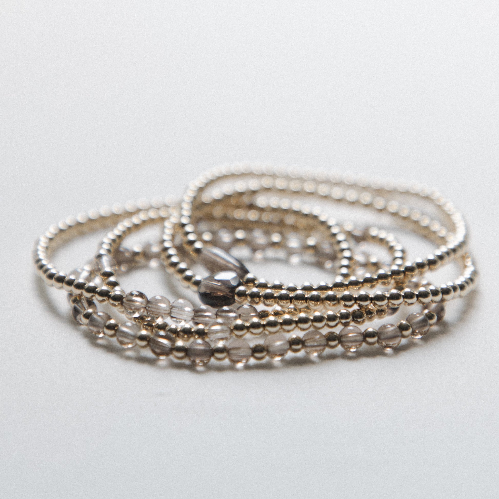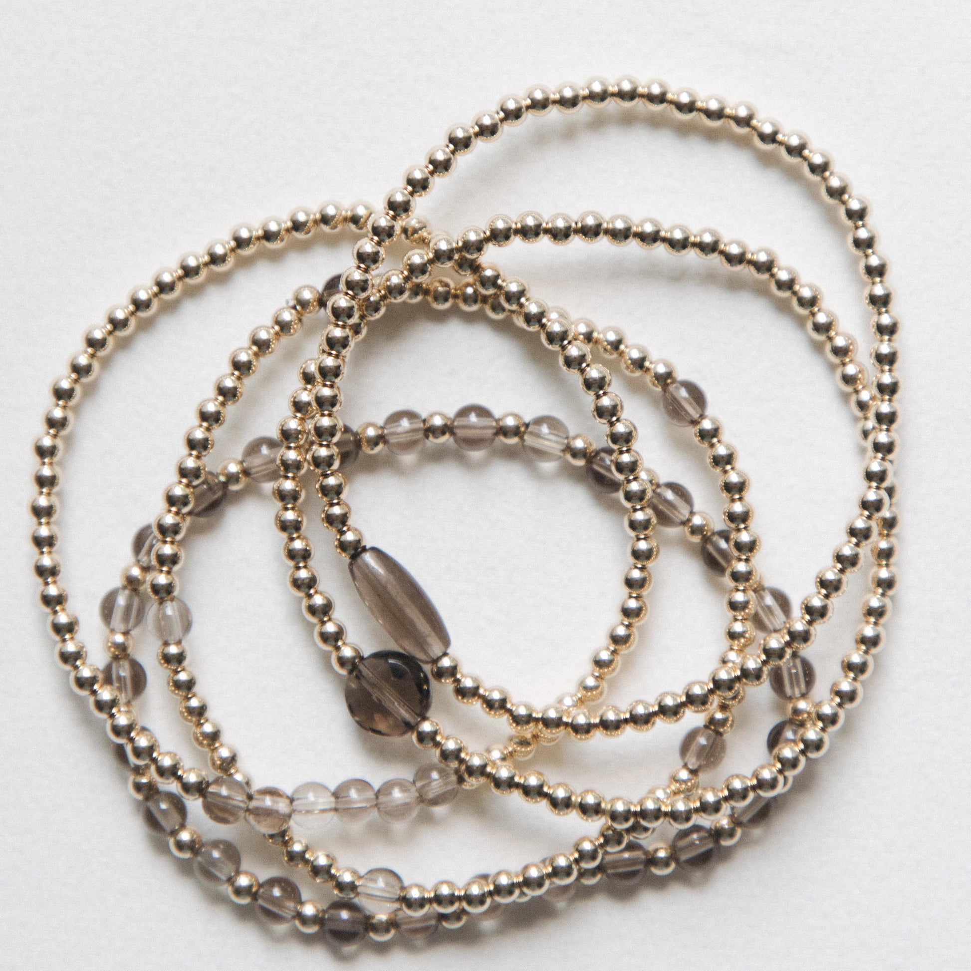 This crystal helps alleviate stress, anxiety, depression and headaches. Smokey Quartz is a grounding stone and can also help with nightmares. Hand-strung on elastic jewelers string, this piece should be rolled on and off instead of stretched. Gold Beads are 14k Gold Filled & will not tarnish.